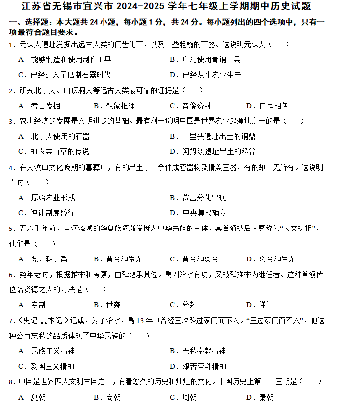 江苏100教学资源网 七上 江苏省无锡市宜兴市2024-2025学年七年级上学期期中历史试题(含答案) https://www.jiangsu100.com/15760.html