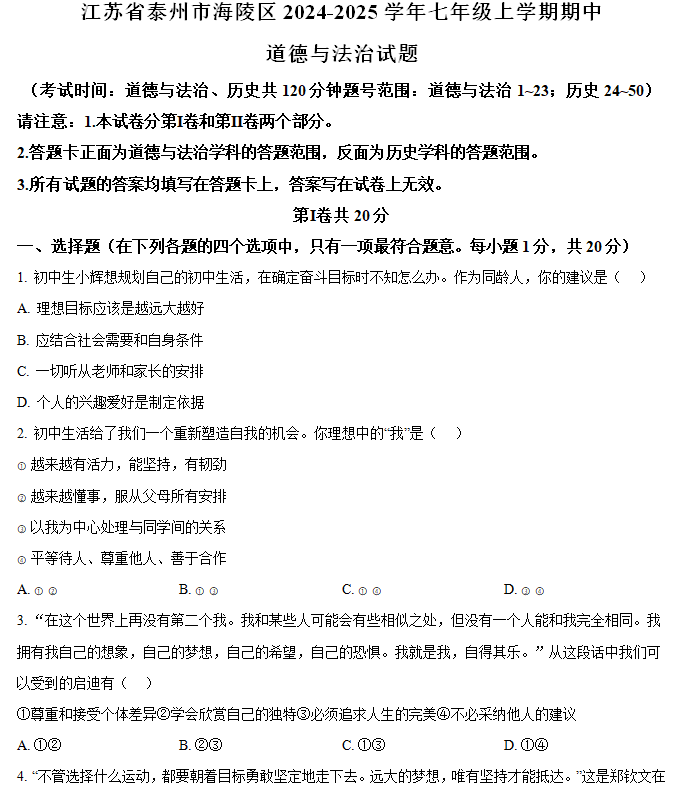 江苏100教学资源网 七上 江苏省泰州市海陵区2024-2025学年七年级上学期期中道德与法治试题(含解析) https://www.jiangsu100.com/15827.html