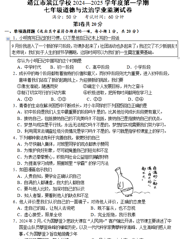 江苏100教学资源网 七上 江苏省泰州市靖江市滨江学校2024-2025学年七年级上学期期中考试道德与法治试卷(含答案) https://www.jiangsu100.com/15836.html