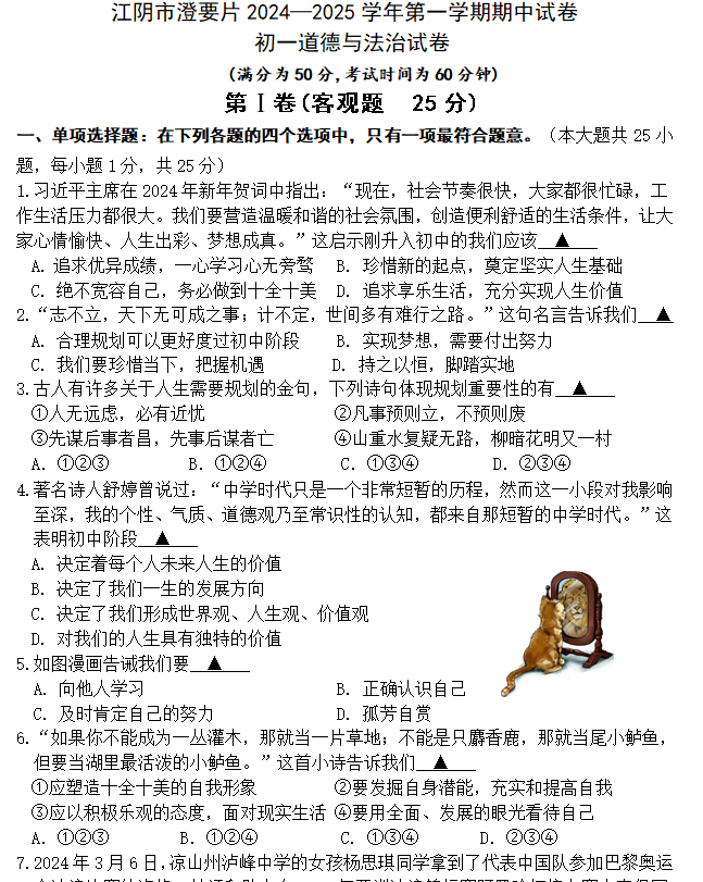 江苏100教学资源网 七上 江苏省无锡市江阴市澄要片2024-2025学年七年级上学期11月期中考试道德与法治试题(含答案) https://www.jiangsu100.com/15854.html