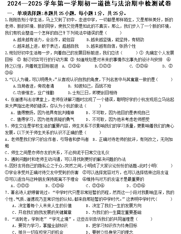 江苏100教学资源网 七上 江苏省无锡市江阴市青阳镇 2024-2025学年七年级上学期期中道德与法治试卷(含答案) https://www.jiangsu100.com/15860.html
