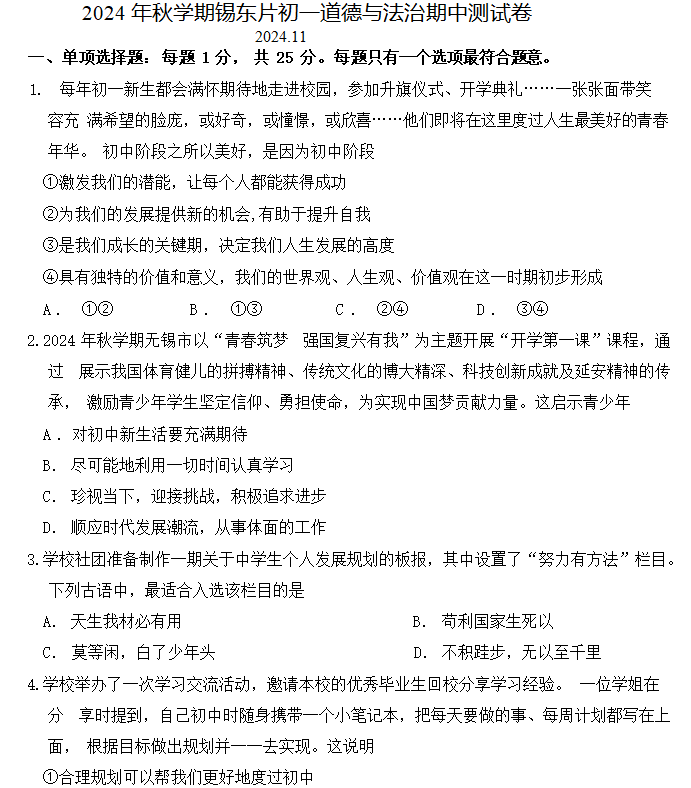 江苏100教学资源网 七上 江苏省无锡市锡东片2024-2025学年七年级上学期期中道德与法治试题(含答案) https://www.jiangsu100.com/15870.html
