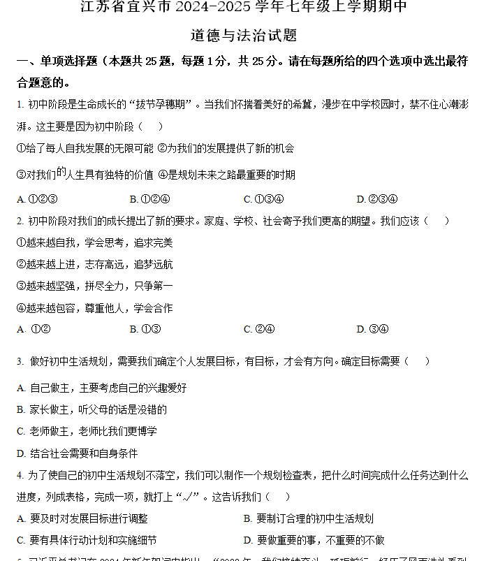 江苏100教学资源网 七上 江苏省无锡市宜兴市2024-2025学年七年级上学期期中道德与法治试题(含解析) https://www.jiangsu100.com/15873.html