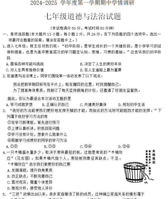 江苏100教学资源网 七上 江苏省徐州市丰县2024-2025学年七年级上学期期中考试道德与法治试题(含答案) https://www.jiangsu100.com/15877.html