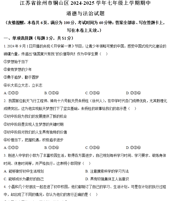 江苏100教学资源网 七上 江苏省徐州市铜山区2024-2025学年七年级上学期期中道德与法治试题(含解析) https://www.jiangsu100.com/15889.html
