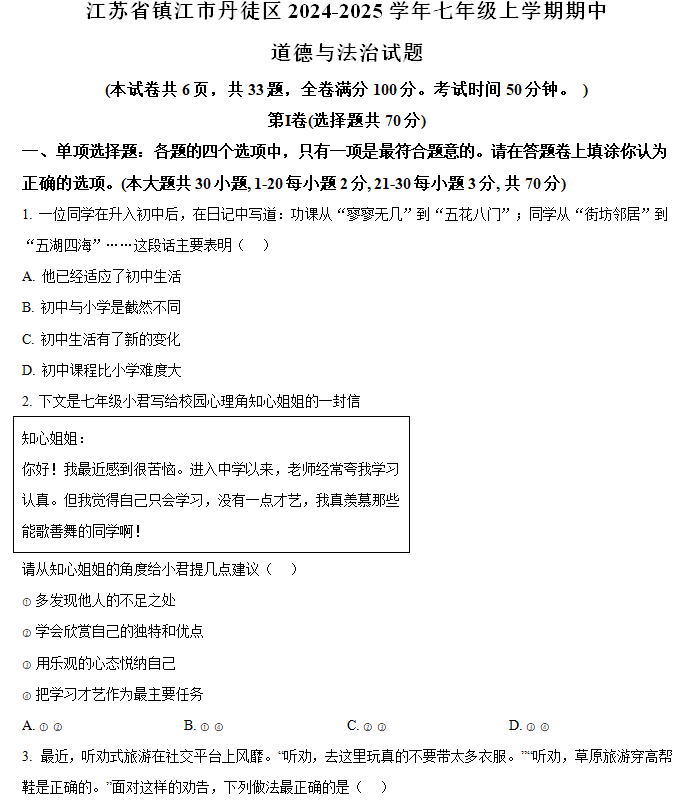 江苏100教学资源网 七上 江苏省镇江市丹徒区2024-2025学年七年级上学期期中道德与法治试题(含解析) https://www.jiangsu100.com/15921.html