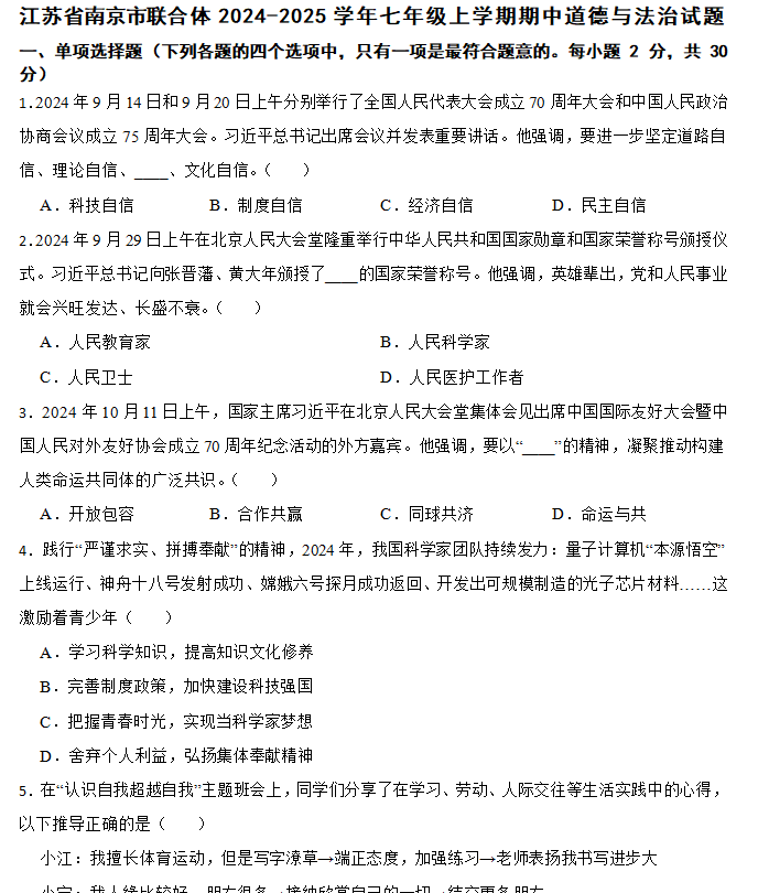 江苏100教学资源网 七上 江苏省南京市联合体2024-2025学年七年级上学期期中道德与法治试题(含解析) https://www.jiangsu100.com/15936.html
