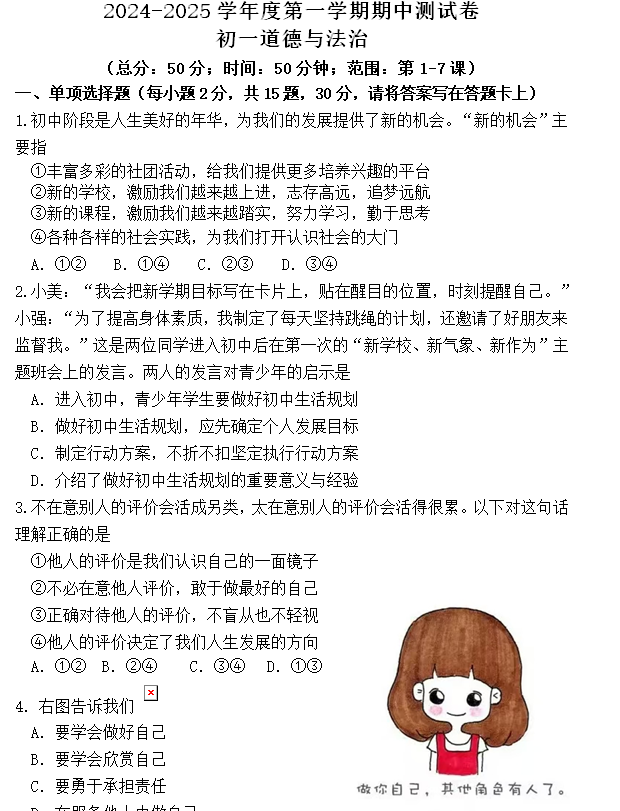 江苏100教学资源网 七上 江苏省南通市海门中学附属学校2024-2025学年七年级上学期期中道德与法治试卷(含答案) https://www.jiangsu100.com/15945.html