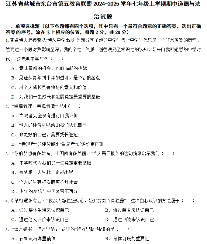 江苏100教学资源网 七上 江苏省盐城市东台市第五教育联盟2024-2025学年七年级上学期期中道德与法治试题(含解析) https://www.jiangsu100.com/15963.html