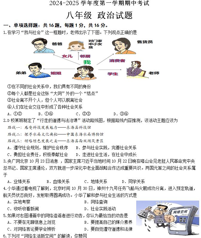 江苏100教学资源网 八上 江苏省连云港市东海县2024-2025学年八年级上学期11月期中道德与法治试题(含答案) https://www.jiangsu100.com/15979.html
