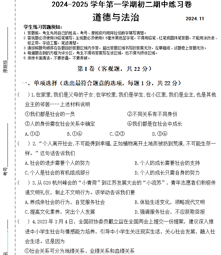 江苏100教学资源网 八上 江苏省苏州市工业园区星海实验初级中学2024-2025学年八年级上学期期中考试道德与法治试卷(含答案) https://www.jiangsu100.com/16011.html