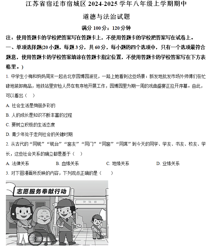 江苏100教学资源网 八上 江苏省宿迁市宿城区2024-2025学年八年级上学期期中道德与法治试题(含解析) https://www.jiangsu100.com/16035.html
