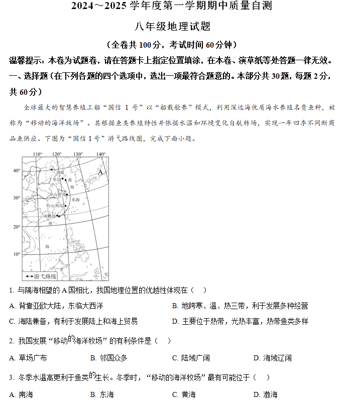 江苏100教学资源网 八上 江苏省徐州市铜山区2024-2025学年八年级上学期期中地理试题(含解析) https://www.jiangsu100.com/16661.html