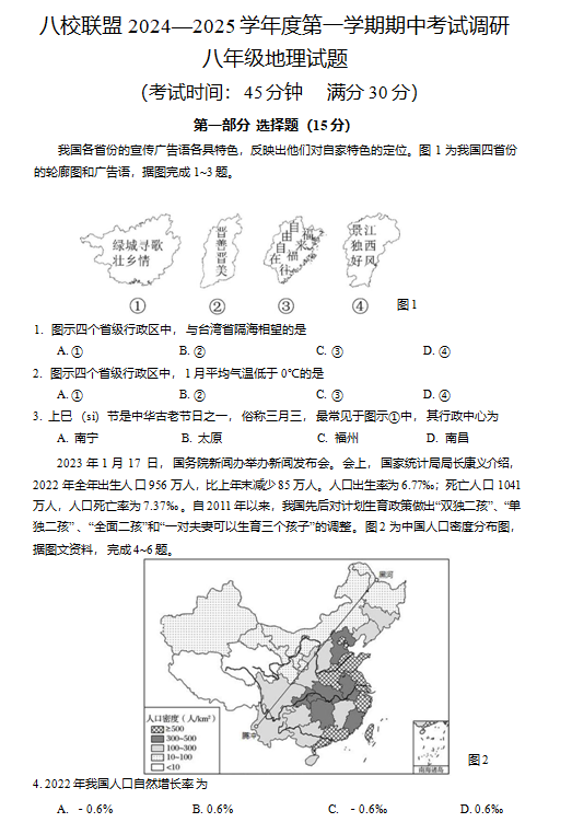 江苏100教学资源网 八上 江苏省泰州市靖江市八校联盟2024-2025学年八年级上学期期中地理试题(含答案) https://www.jiangsu100.com/16712.html