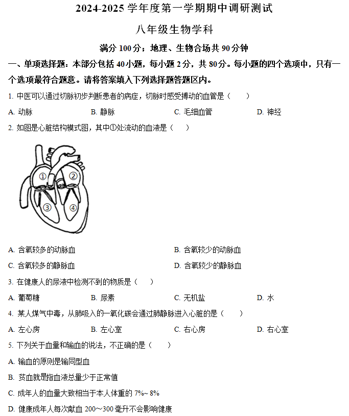 江苏100教学资源网 八上 江苏省宿迁市宿城区2024-2025学年八年级上学期期中生物试题(含解析) https://www.jiangsu100.com/16758.html