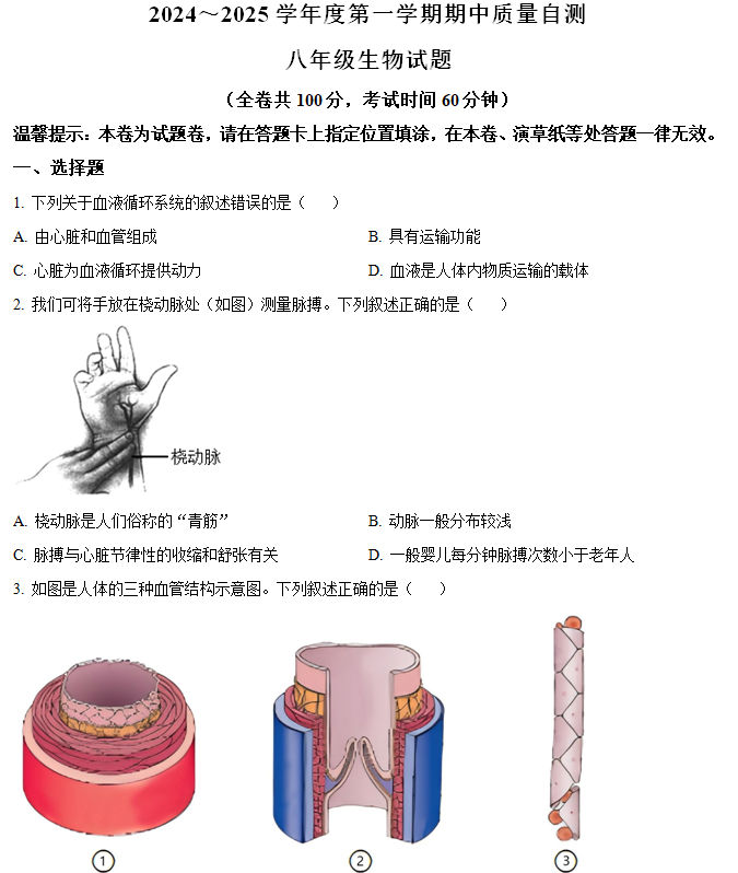江苏100教学资源网 八上 江苏省徐州市铜山区2024-2025学年八年级上学期期中生物学试题(含解析) https://www.jiangsu100.com/16785.html