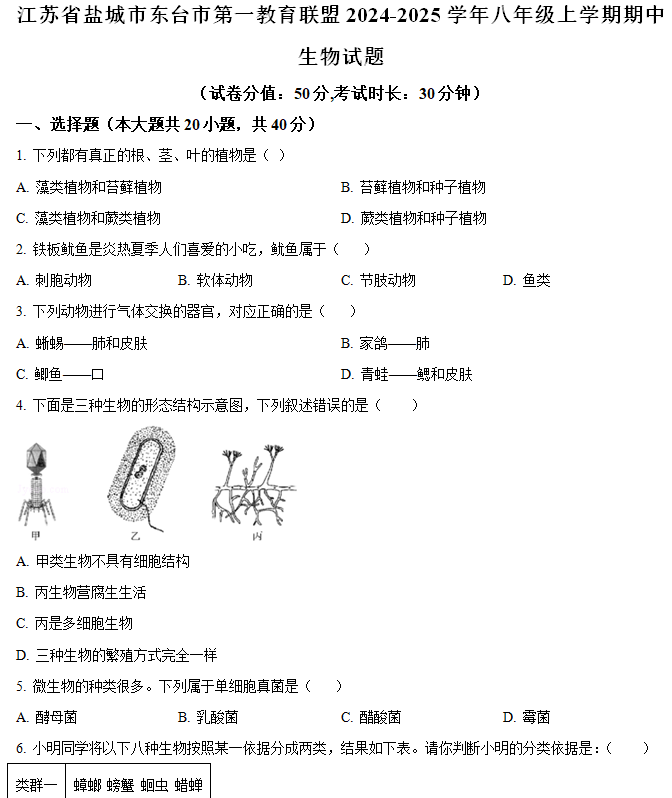 江苏100教学资源网 八上 江苏省盐城市东台市第一教育联盟2024-2025学年八年级上学期期中生物试题(含解析) https://www.jiangsu100.com/16797.html
