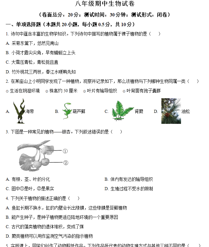 - 江苏省泰州市医药高新区(高港区)2024-2025学年八年级上学期期中生物试题(含答案) 2025-10-30