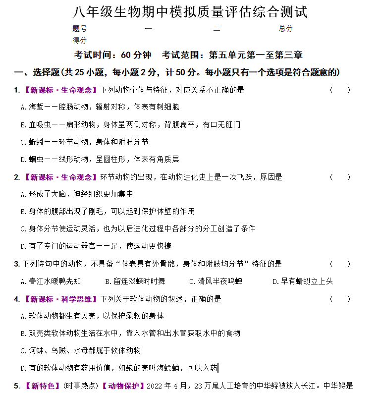 江苏100教学资源网 八上 江苏省南京市南京大学附属中学2024~2025学年八年级上学期期中模拟质量评估生物综合测试(含解析) https://www.jiangsu100.com/16842.html