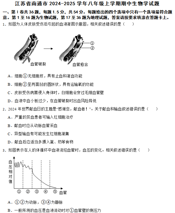 江苏100教学资源网 八上 江苏省南通市2024-2025学年八年级上学期期中生物学试题(含答案) https://www.jiangsu100.com/16845.html