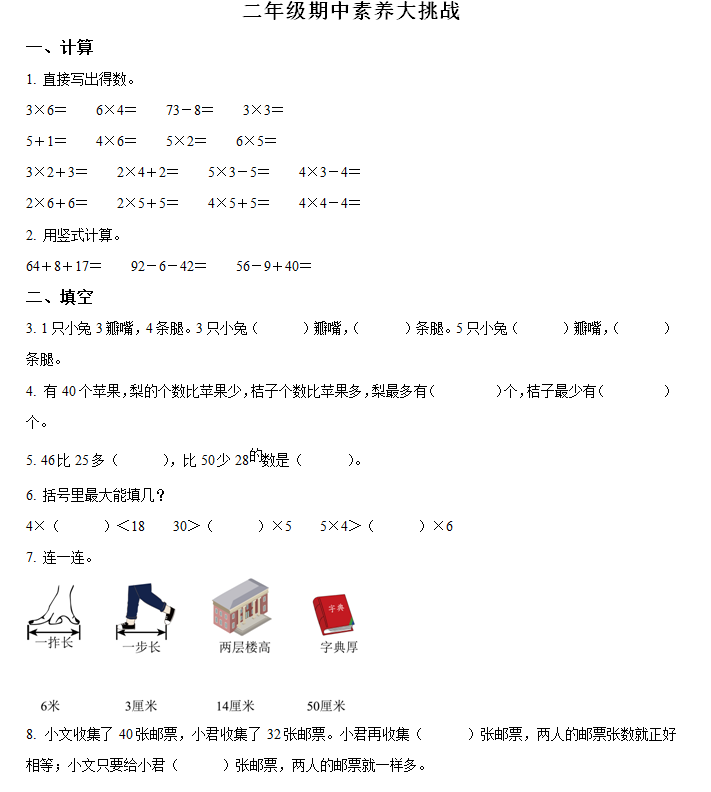 - 2024-2025学年江苏省徐州市邳州市苏教版二年级上册期中素养测评数学试卷(含解析) 2025-11-06