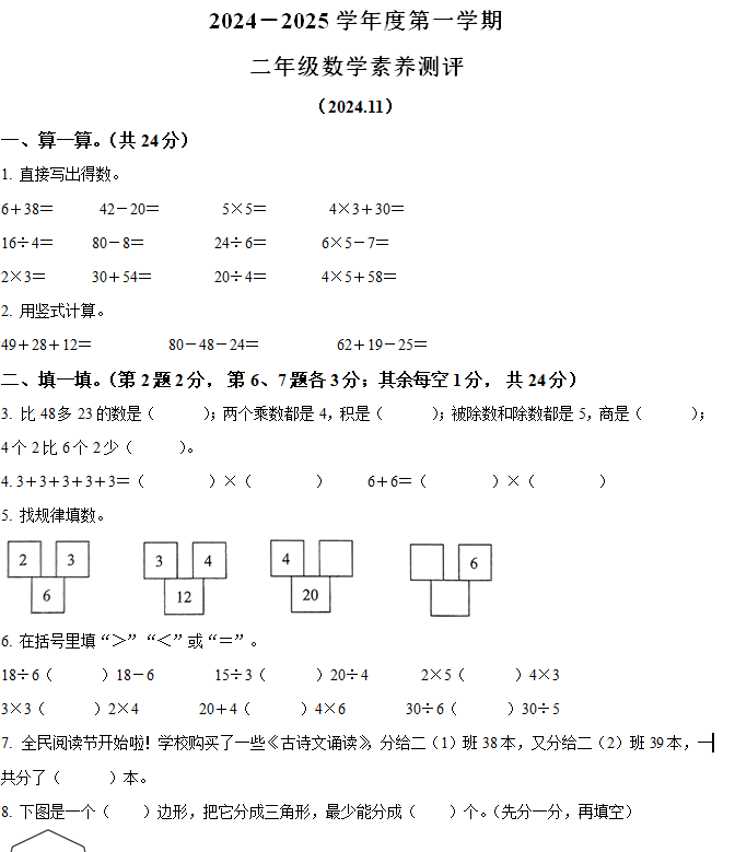江苏100教学资源网 二上 2024-2025学年江苏省徐州市邳州市苏教版二年级上册期中素养测评数学试卷(含解析) https://www.jiangsu100.com/17002.html