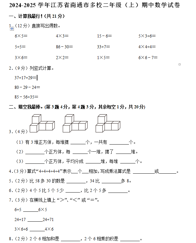 江苏100教学资源网 二上 江苏省南通市多校2024-2025学年二年级上学期期中数学试卷(含解析) https://www.jiangsu100.com/17020.html