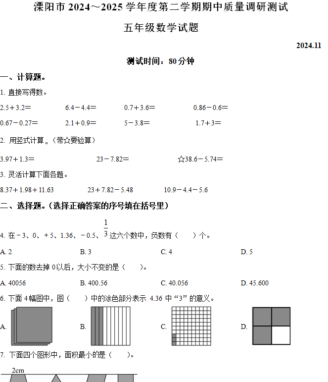 江苏100教学资源网 五上 2024-2025学年江苏省常州市溧阳市苏教版五年级上册期中测试数学试卷(含解析) https://www.jiangsu100.com/17181.html