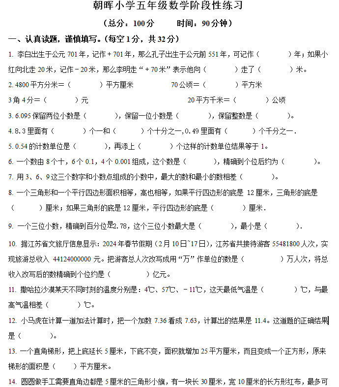江苏100教学资源网 五上 2024-2025学年江苏省南通市朝晖小学苏教版五年级上册期中测试数学试卷(含解析) https://www.jiangsu100.com/17205.html