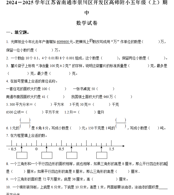 江苏100教学资源网 五上 2024-2025学年江苏省南通市崇川区江苏省南通师范学校第一附属小学苏教版五年级上册期中测试数学试卷(含解析) https://www.jiangsu100.com/17208.html