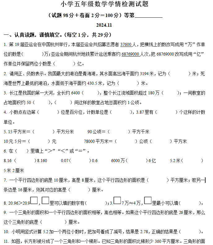 江苏100教学资源网 五上 2024-2025学年江苏省宿迁市沭阳县苏教版五年级上册期中测试数学试卷(含解析) https://www.jiangsu100.com/17217.html