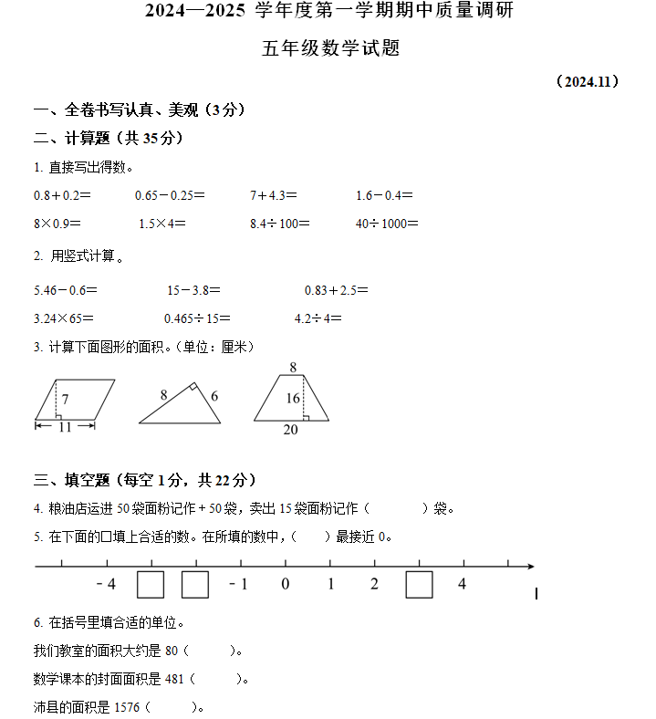 江苏100教学资源网 五上 2024-2025学年江苏省徐州市沛县新城实验学校苏教版五年级上册期中测试数学试卷(含解析) https://www.jiangsu100.com/17232.html