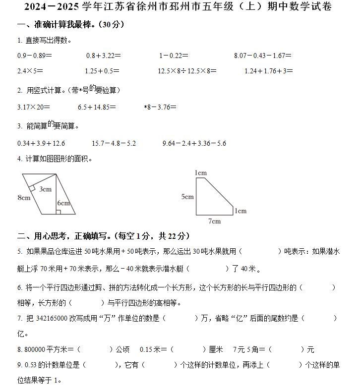 江苏100教学资源网 五上 2024-2025学年江苏省徐州市邳州市苏教版五年级上册期中测试数学试卷(含解析) https://www.jiangsu100.com/17235.html