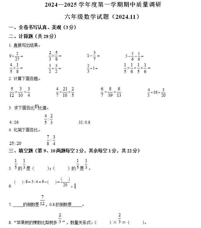 江苏100教学资源网 六上 2024-2025学年江苏省徐州市沛县苏教版六年级上册期中测试数学试卷(含解析) https://www.jiangsu100.com/17284.html