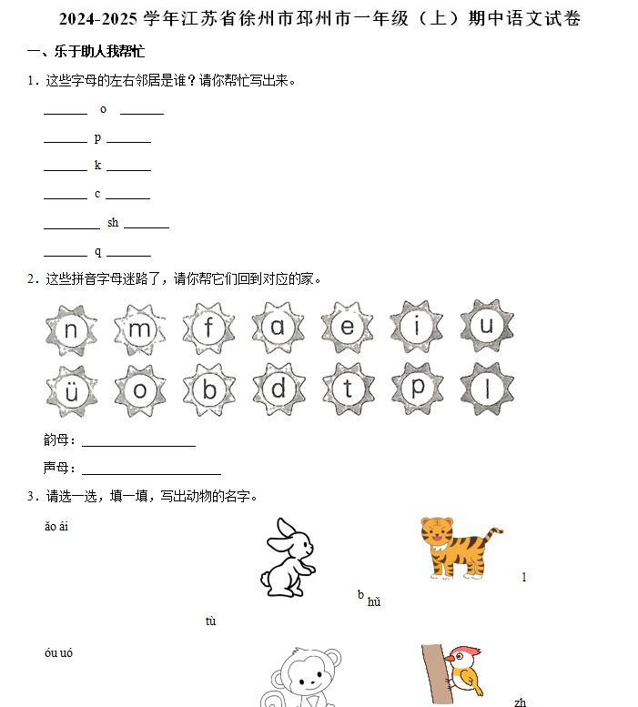 江苏100教学资源网 一上 2024-2025学年江苏省徐州市邳州市一年级(上)期中语文试卷(含解析) https://www.jiangsu100.com/17363.html