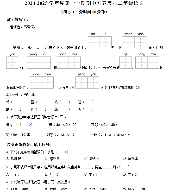 江苏100教学资源网 二上 2024-2025学年江苏省宿迁市统编版二年级上册期中考试语文试卷(含解析) https://www.jiangsu100.com/17381.html