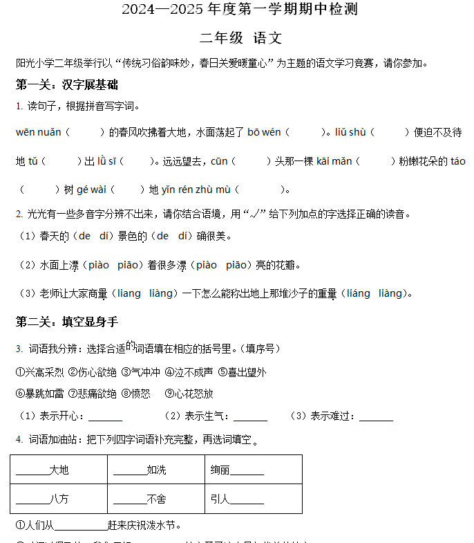 江苏100教学资源网 二上 2024-2025学年江苏省扬州市统编版二年级上册期中考试语文试卷(含解析) https://www.jiangsu100.com/17393.html