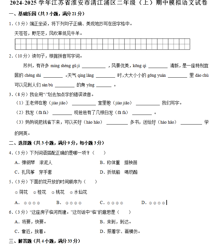 江苏100教学资源网 二上 2024-2025学年江苏省淮安市清江浦区二年级(上)期中模拟语文试卷(含解析) https://www.jiangsu100.com/17409.html