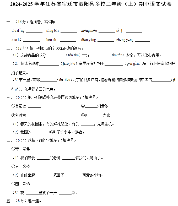 江苏100教学资源网 二上 江苏省宿迁市泗阳县多校2024-2025学年二年级上学期期中考试语文试题(含答案) https://www.jiangsu100.com/17427.html
