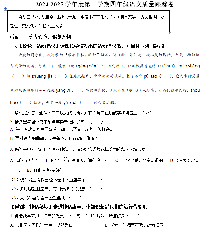 江苏100教学资源网 四上 2024-2025学年江苏省苏州市新区统编版四年级上册期中考试语文试卷(含解析) https://www.jiangsu100.com/17497.html