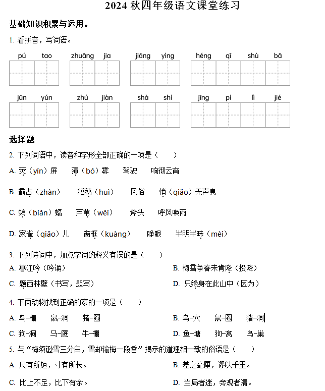 江苏100教学资源网 四上 2024-2025学年江苏省盐城市东台市第五联盟统编版四年级上册期中考试语文试卷(含解析) https://www.jiangsu100.com/17500.html