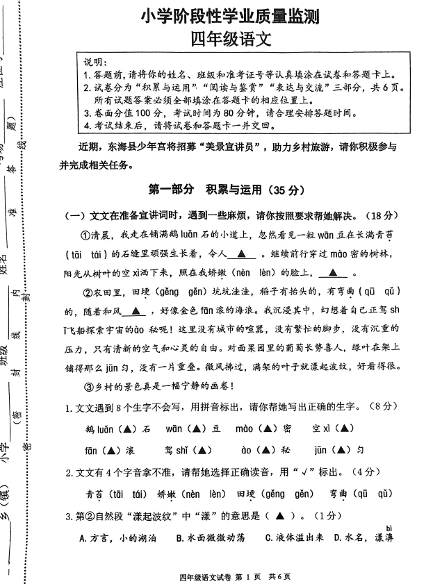江苏100教学资源网 四上 江苏省连云港市东海县2024-2025学年四年级上学期期中语文试题(含答案) https://www.jiangsu100.com/17509.html