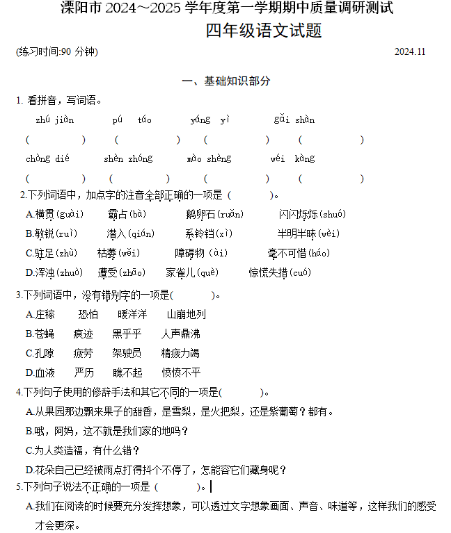 江苏100教学资源网 四上 江苏省常州市溧阳市2024-2025学年四年级上学期11月期中语文试题(含答案) https://www.jiangsu100.com/17522.html