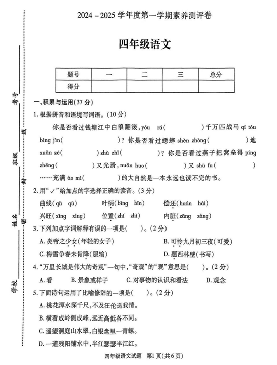 江苏100教学资源网 四上 江苏省徐州市丰县2024-2025学年四年级上学期11月期中语文试题(含答案) https://www.jiangsu100.com/17543.html