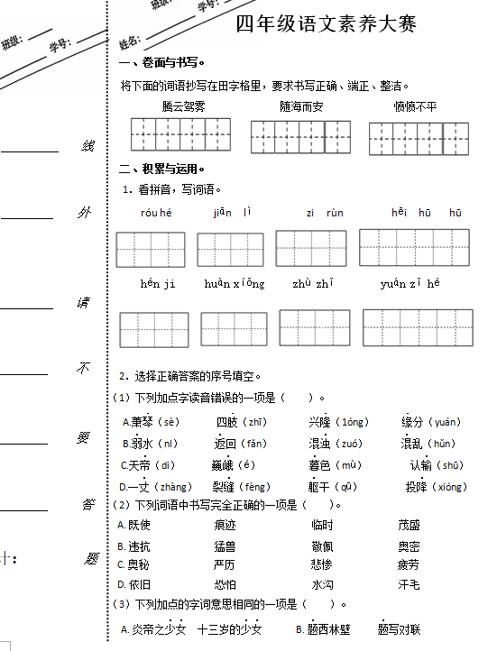 江苏100教学资源网 四上 江苏省盐城市某校2024-2025学年四年级上学期期中素养大赛语文试卷(含答案) https://www.jiangsu100.com/17546.html