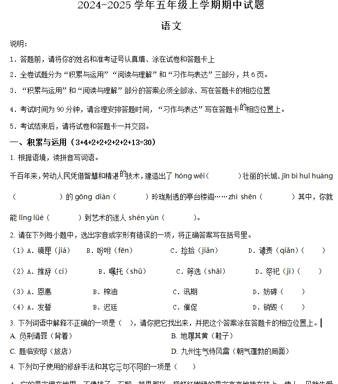 - 江苏省盐城市某区2024-2025学年五年级上册期中考试语文试卷(含答案) 2025-11-12