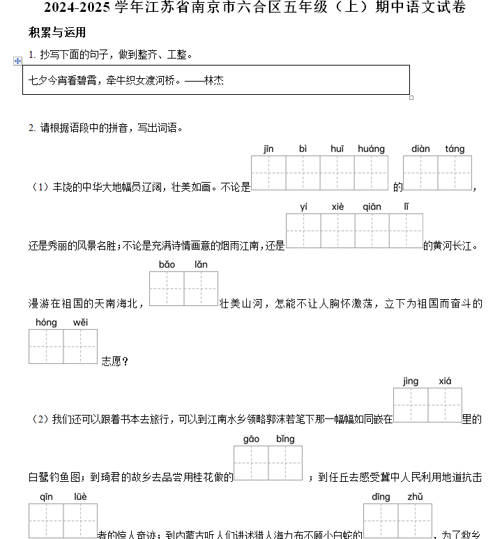江苏100教学资源网 五上 2024-2025学年江苏省南京市六合区统编版五年级上册期中考试语文试卷(含解析) https://www.jiangsu100.com/17558.html