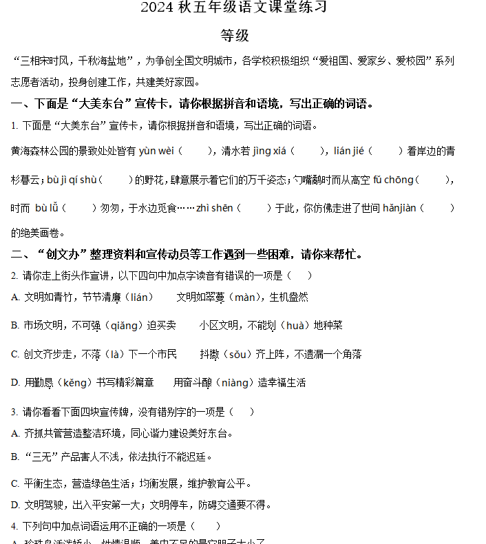 江苏100教学资源网 五上 2024-2025学年江苏省盐城市东台市第五联盟统编版五年级上册期中考试语文试卷(含解析) https://www.jiangsu100.com/17568.html