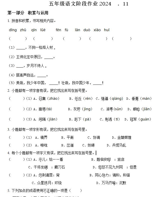 江苏100教学资源网 五上 2024-2025学年江苏省盐城市阜宁县统编版五年级上册期中考试语文试卷(含解析) https://www.jiangsu100.com/17571.html