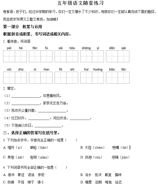 - 江苏省盐城市某区2024-2025学年五年级上册期中考试语文试卷(含答案) 2025-11-12